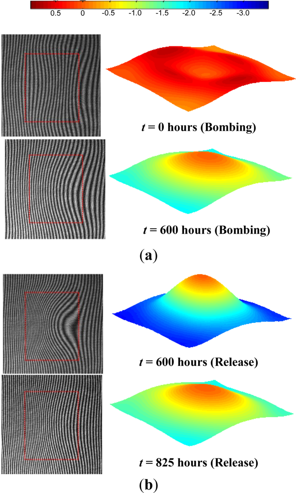After the calibration curve was obtained, the package was subjected to a constant bombing pressure of 4 atm (gage) and the deflections were measured as a function of time. The bombing pressure was maintained for 600 h. There was no noticeable deflection change after 600 h, indicating that the cavity pressure was equal to the bombing pressure. At this point, the “release” stage was initiated by closing the helium gas valve and opening the chamber to the atmospheric environment (0 atm of helium). The surface deflection was also documented regularly during the release stage. Representative fringe images and corresponding 3D maps are shown in Figure 12(a,b) for the bombing and release stages, respectively.