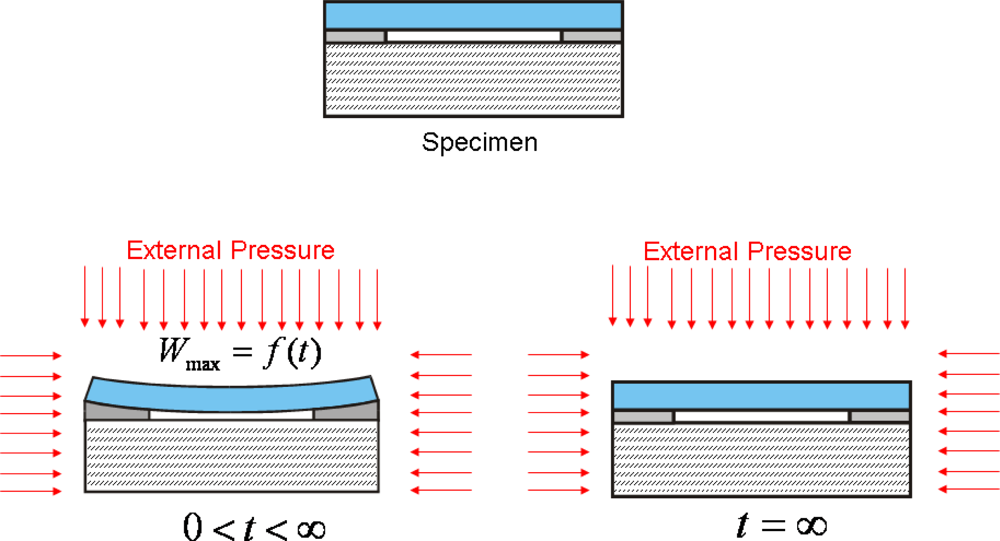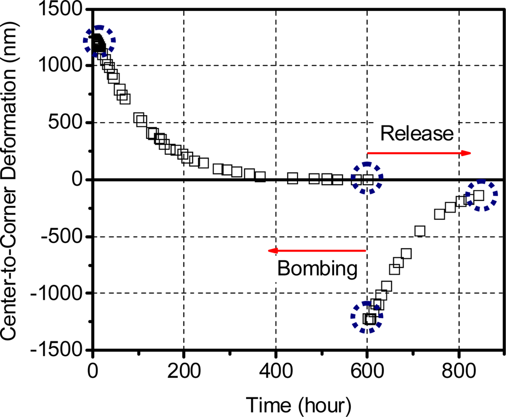 The basic principle of the optical leak test [,,] is depicted in Figure 8. A MEMS package is first subjected to a pressurized gas (i.e., constant external pressure). As gas leaks into the package, the pressure differential (i.e., the difference between the external pressure and the cavity internal pressure) changes over a period of time. This change in pressure differential induces a change in specimen deformation that is recorded experimentally as a function of time. The experimental data is converted to the pressure differential using the pre-determined relationship between the pressure differential and the specimen deformation (calibration curve). Then, the time-dependent internal cavity pressure can be determined by subtracting the pressure differential from the known external pressure.