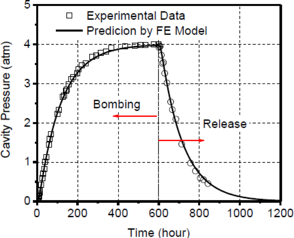 A finite element model based on the effective-volume scheme was built to simulate the cavity pressure evolution during the bombing and release stage. The modeling prediction is compared with the experimental data in Figure 14. It is evident that the diffusion model follows the experimentally observed cavity pressure change extremely accurately. This corroborates the validity of the diffusion based hermetic behavior of polymer-sealed MEMS packages and also validates the assumptions used in the boundary conditions for the finite element model.
