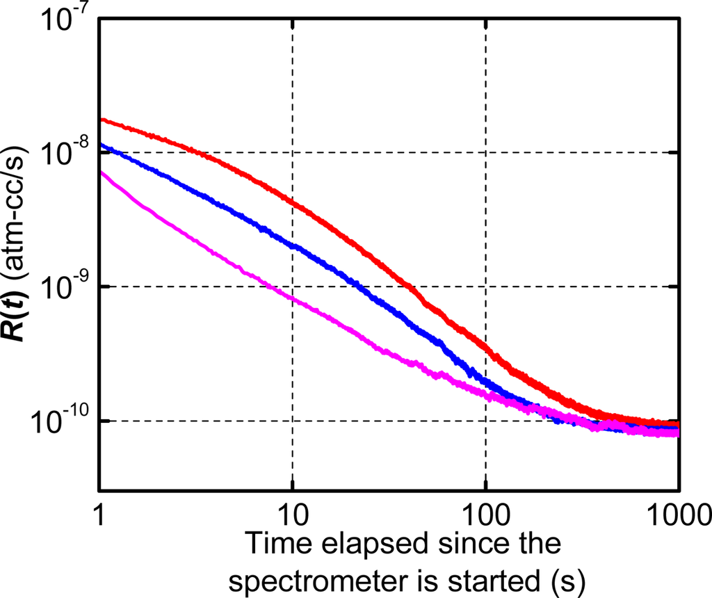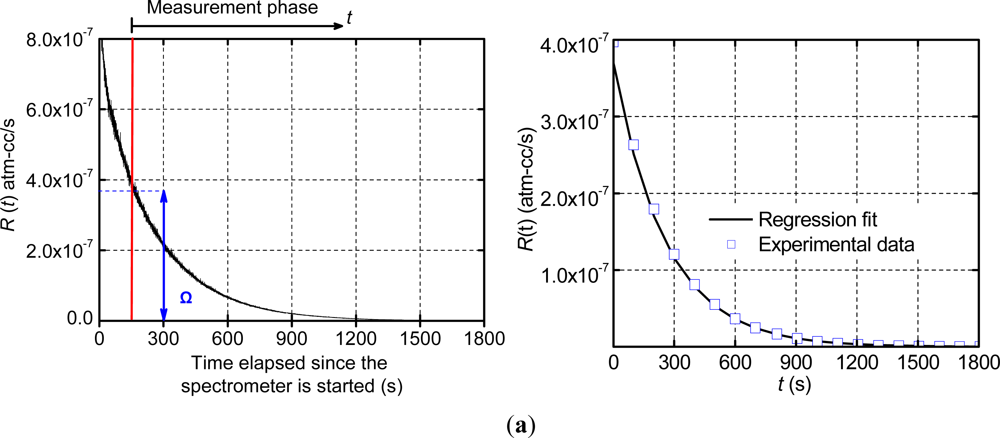 The output of the spectrometer is the measured leak rate (R), which is defined as the leak rate of a given package as measured under specified test conditions []. The measured leak rate is also referred to as “apparent leak rate”, which decreases as a function of time. In practice only the initial apparent leak rate (Ri), i.e., the measured leak rate at the instant the spectrometer is switched on, is used as a measure of hermeticity [].