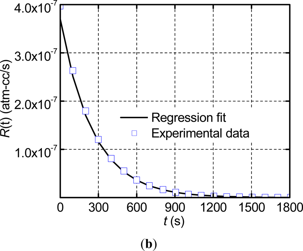 The data of the measurement phase was utilized to determine the true leak rate through the regression analysis. The data was trimmed at a value of R(t) =2.5 × 10−10 atm-cm3/s in order to negate the effect of the stabilized zero signal (10−10 atm-cm3/s) on the regression. The analysis was conducted using MATLAB, and yielded a true leak rate value of 3.12 × 10−7 atm-cm3/s with the goodness of fit, R2, equal to 0.995. The experimental data of the measurement phase are replotted in Figure 5(b) together with the numerical result from the regressions analysis (i.e., a plot of Equation (16) using the values of Ω and La determined from the regression analysis). As expected from the extremely high value of R2, the regression results and the experimental data are nearly identical. It is to be noted that only a few experimental data points are shown in Figure 5(b) in order to distinguish them from the regression fit.