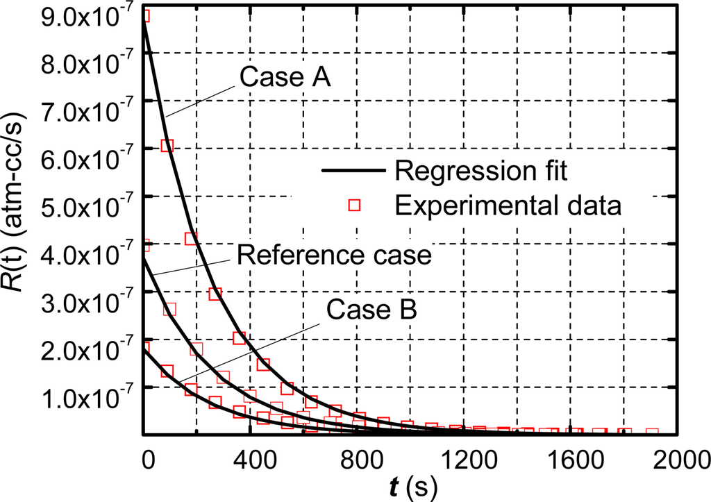 The regression technique yields the true leak rate values of 2.99 × 10−7 atm-cm3/s (Case A) and 3.20 × 10−7 atm-cm3/s (Case B), which have less than 4% variation compared with the value of the reference case (3.12 × 10−7 atm-cm3/s). These consistent values validate the efficacy of the proposed method.