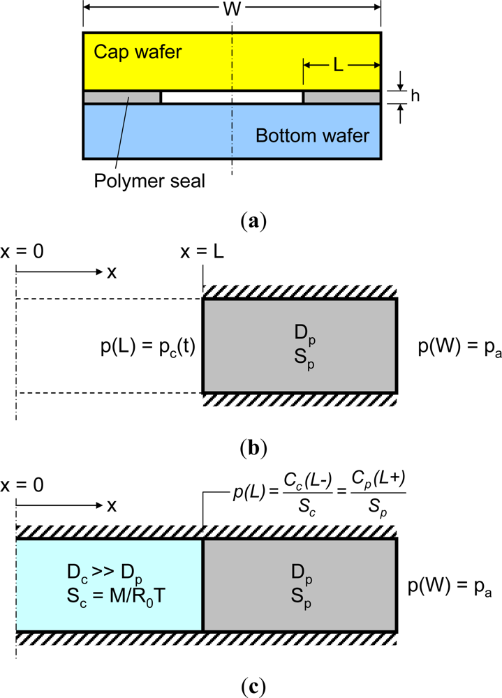 The effective volume scheme transforms the original single material diffusion problem with transient boundary conditions into a bi-material gas diffusion problem with fixed boundary conditions. Consequently, the Nernst distribution law should be considered for mass continuity at the cavity-polymer seal interface [the inner surface of the polymer seal, x = L in Figure 7(c)], which can be expressed as []: