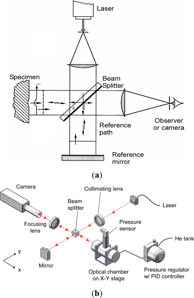 The surface topology of the package is documented by a classical laser interferometry configuration called Twyman/Green interferometry []. The technique is simple and is ideally suited for MEMS packages since the package surface is specular, which is a critical requirement for the method. As illustrated in Figure 9(a), an expanded laser beam is collimated by a collimating lens. The collimated light is split into two—one directed towards the specimen and the other towards the reference mirror (an optical flat). The reflected wave fronts recombine and interfere to form an interferogram (or fringe pattern). The interferogram provides a contour map of the surface topography.