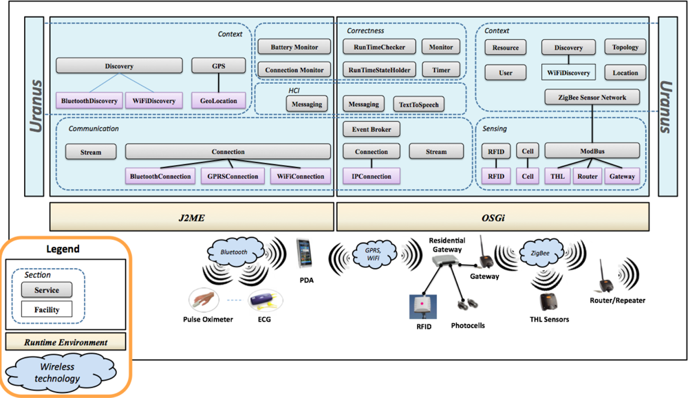 In Uranus the residential gateway is also the collecting point of sensed vital signs. Vital data are sensed by sensors and transmitted to a mobile device over a bluetooth network. Next, data are sent to the residential gateway by means of either a WiFi or a GPRS connection. The residential gateway can also catch environmental data sensed by zigbee sensors. Finally, it can be used to build a local monitoring station or to forward (some/all) sensed data towards a remote station deployed, for an example, in a hospital.