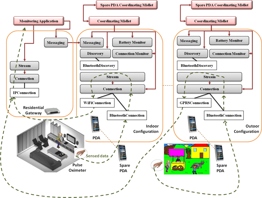 This application has been realized for the long term (e.g., for 48 h) monitoring of the oxygen in the blood of a chronically ill patient. A residential gateway is deployed at the home of the patient, although the monitoring must continue even when the patient is at work or elsewhere outside the home. This rises the need of handling implicit requirements like the power consumption of battery driven devices, network switching, and reliability assurance.