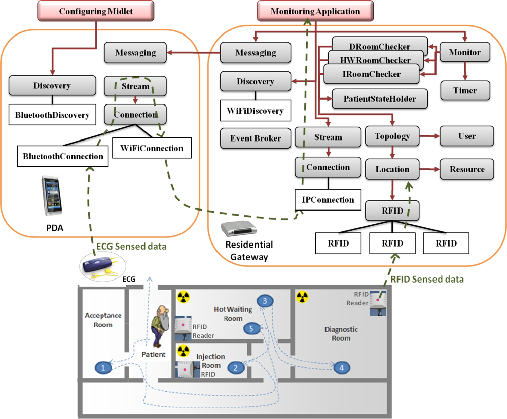Within the acceptance room, an operator registers the patient with the User Service and equips him with an RFID tag, an ECG sensor, and a PDA. The resources are rapidly configured by means of services like the Discovery Service and applications like the Configuring Midlet, and are associated to the user by means of the Resource Service. From this moment, the patient’s heart rate is monitored and the data stream is handled as in the previous case study.
