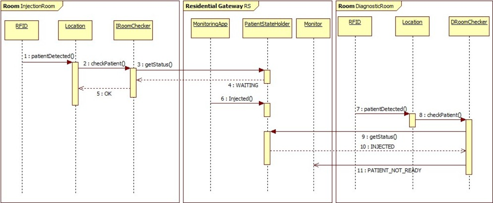 Figure 5 shows some of the interactions between a subset of software components into the department. In particular, after having been located into the injection room, the monitoring application updates the patient status. Next, the patient enters the diagnostic room by mistake. As a consequence, a correctness properties is violated and the diagnostic room checker alerts the monitor service. Successively (not shown in the figure), a message is sent to the patient’s mobile device and to the staff of the diagnostic room.
