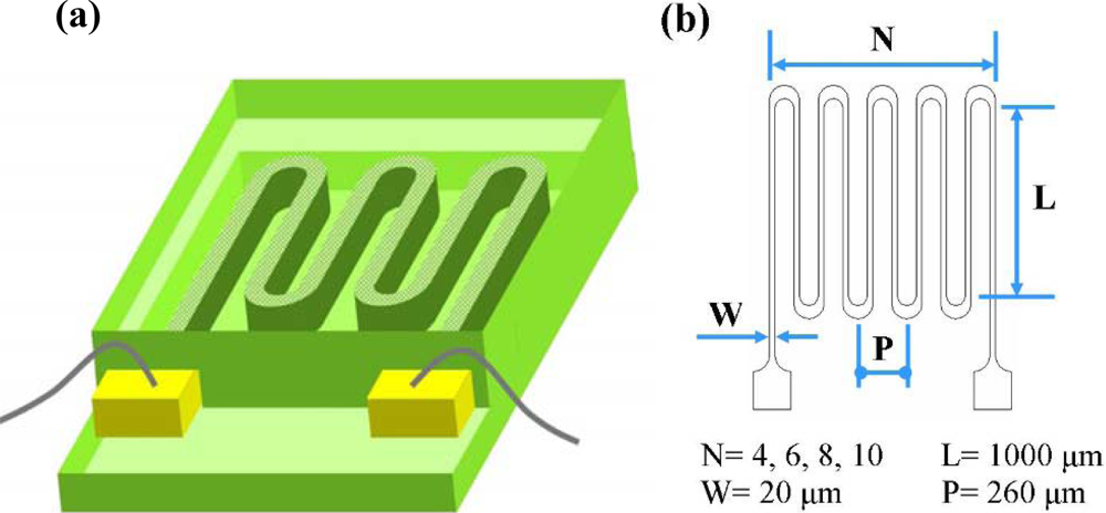 The commercial strain sensors were assembled by wire, metal foil (sensing element), laminate film (waterproof layer), and a base substrate. The resistance of the metal foil gauge changes with strain during stress loading, and the strain can be determined by the change in electrical resistance. A serpentine pattern is commonly used for commercial strain sensors. In this study, we used single-walled carbon nanonets (SWCNNs) to replace the customary metal foil. Parylene-C was used as the waterproof layer, and another layer of Parylene-C was used as the base (Figure 1(a)). Further, to determine the Gauge Factor scale-down effects for the CNNs under different geometries, a serpentine pattern with different numbers of turns, a constant length and various widths of CNN was designed (Figure 1(b)).