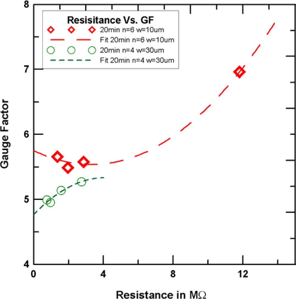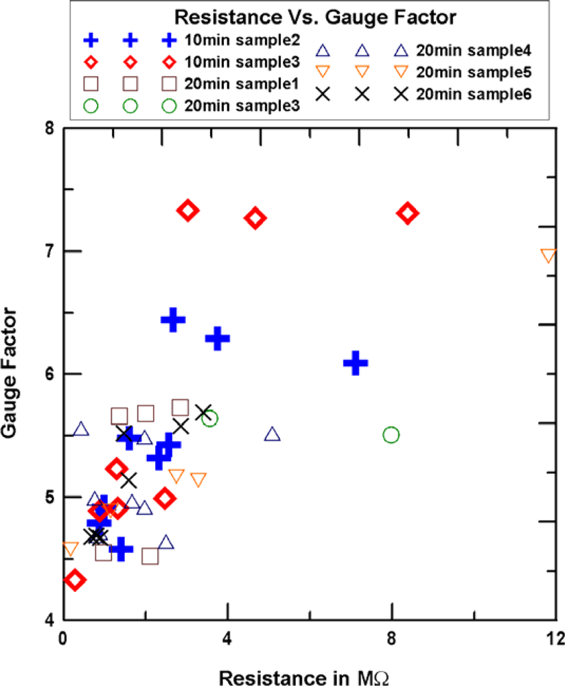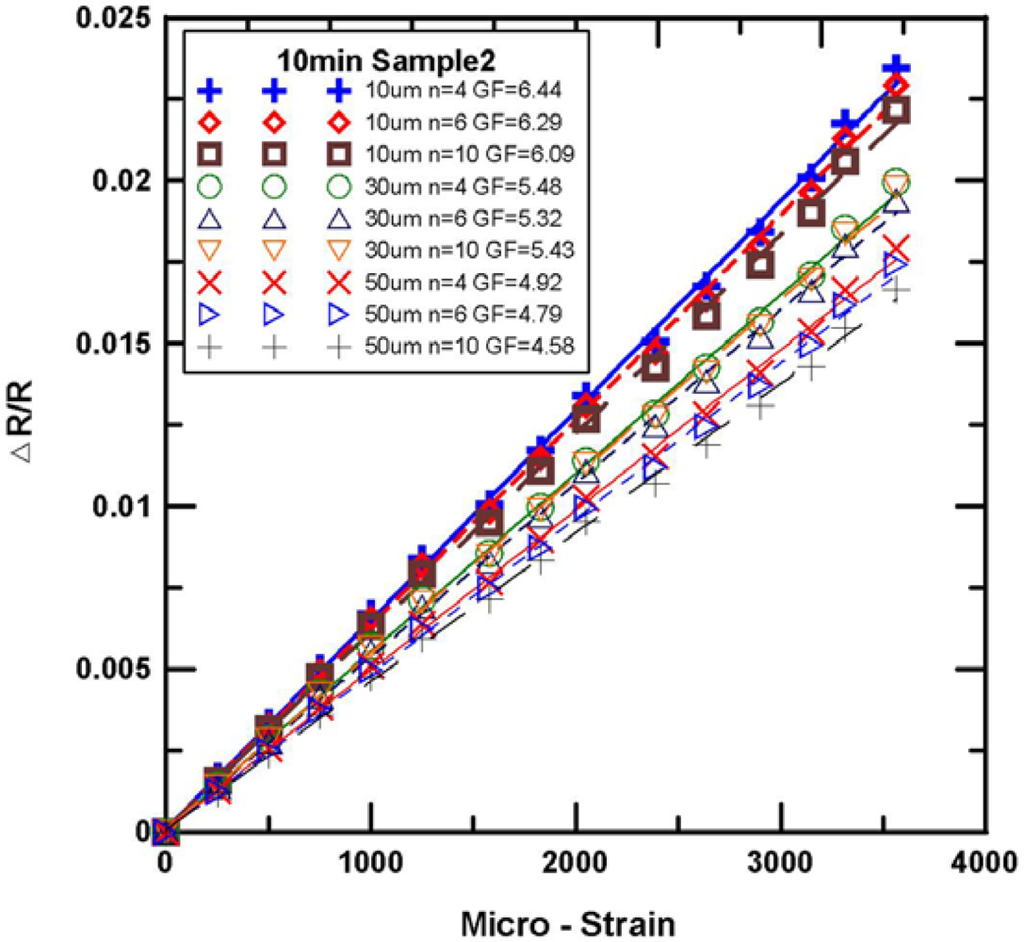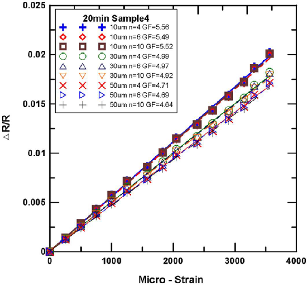 The relationship between gauge factors and resistances is shown in Figure 11. As seen in this figure, generally, the gauge factor of SWCNNs sensors with a growth time of 10 min is larger than that with a growth time of 20 min.