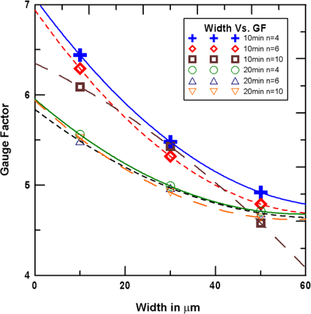 Figures 9 and 10 show the experimental results for the tensile test of the Parylene-based SWCNN strain sensors. Nine strain sensors with various lengths were obtained. The relative changes of the resistance of the strain sensors were increased when tension loading was applied. The gauge factor was calculated from the graph by the following equation: