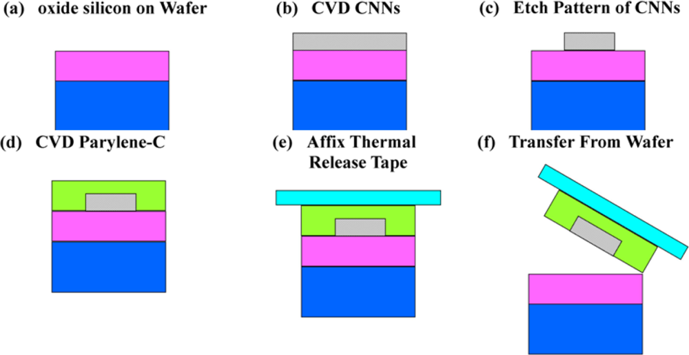 The manufacturing process for the presented strain sensing device is summarized in Figure 2. First, a 500 nm oxide layer is grown on a silicon wafer (Figure 2(a)). The surface of the SiO2 layer is not naturally hydrophilic. In order to make the surface hydrophilic for uniform coating with nanosize metal catalysts, the surface of the oxide substrate is first treated with standard cleaning solutions 1 and 2 (SC1 and SC2) then, subsequently dipped in a Co/Mo solution. After dipping, the wafer was placed into the alcohol catalytic chemical vapor deposition (ACCVD) apparatus for growing CNNs (Figure 2(b)). Next, Reactive Ion Etching was used to etch CNNs to form the serpentine pattern (Figure 2(c)). The wafer with the SWCNN pattern was subsequently placed into the Parylene deposition equipment (Specialty Coating System, Model PDS-2010) for a 6 μm thick Parylene-C coating. A thermal release tape (green layer) was used to bond the Parylene-C layer with the CNN serpentine pattern (Figure 2(d,e)).