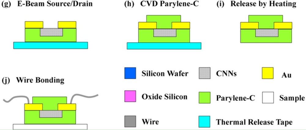 Then, a gold layer is used as the source drain electrodes using the lift-off process (Figure 2(g)). Finally, the device was placed into the Parylene deposition equipment again for another Parylene-C coating to form the waterproof layer. After these fabrication steps, the presented strain sensor was released from the thermal release tape by heating for 1 min at 120 °C.