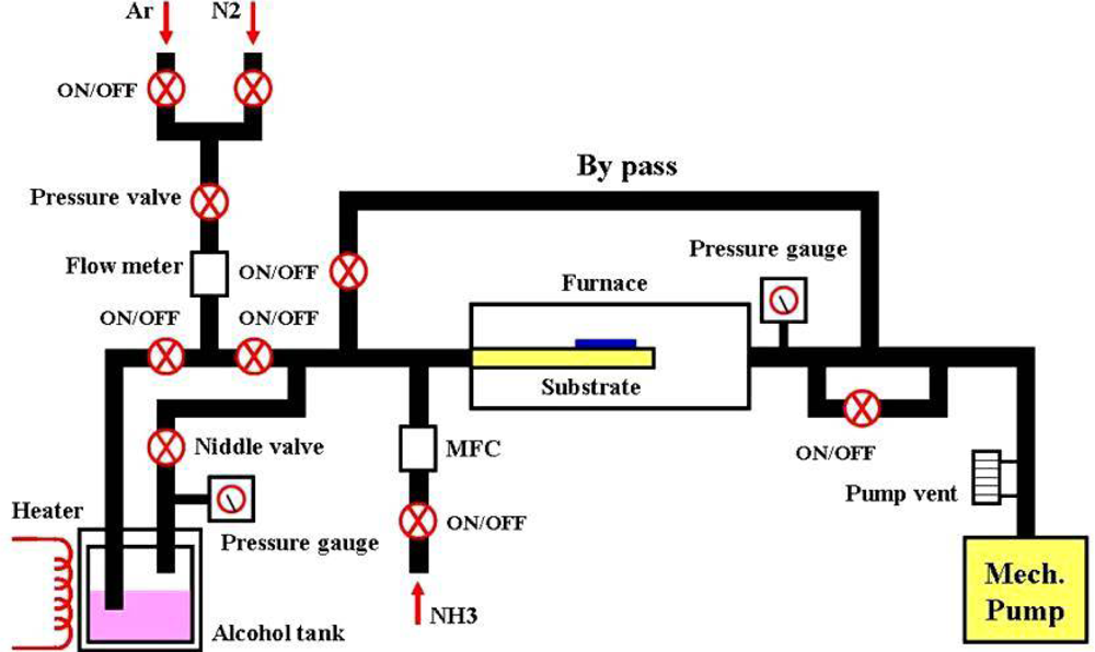 In this study, the sensing material of the sensor, that is, single-walled carbon nanonets, which were grown using alcohol catalytic chemical vapor deposition equipment (ACCVD, as shown in Figure 3), was provided by National Nano Device Laboratories (NDL, Taiwan). The entire process is shown in Figure 4.