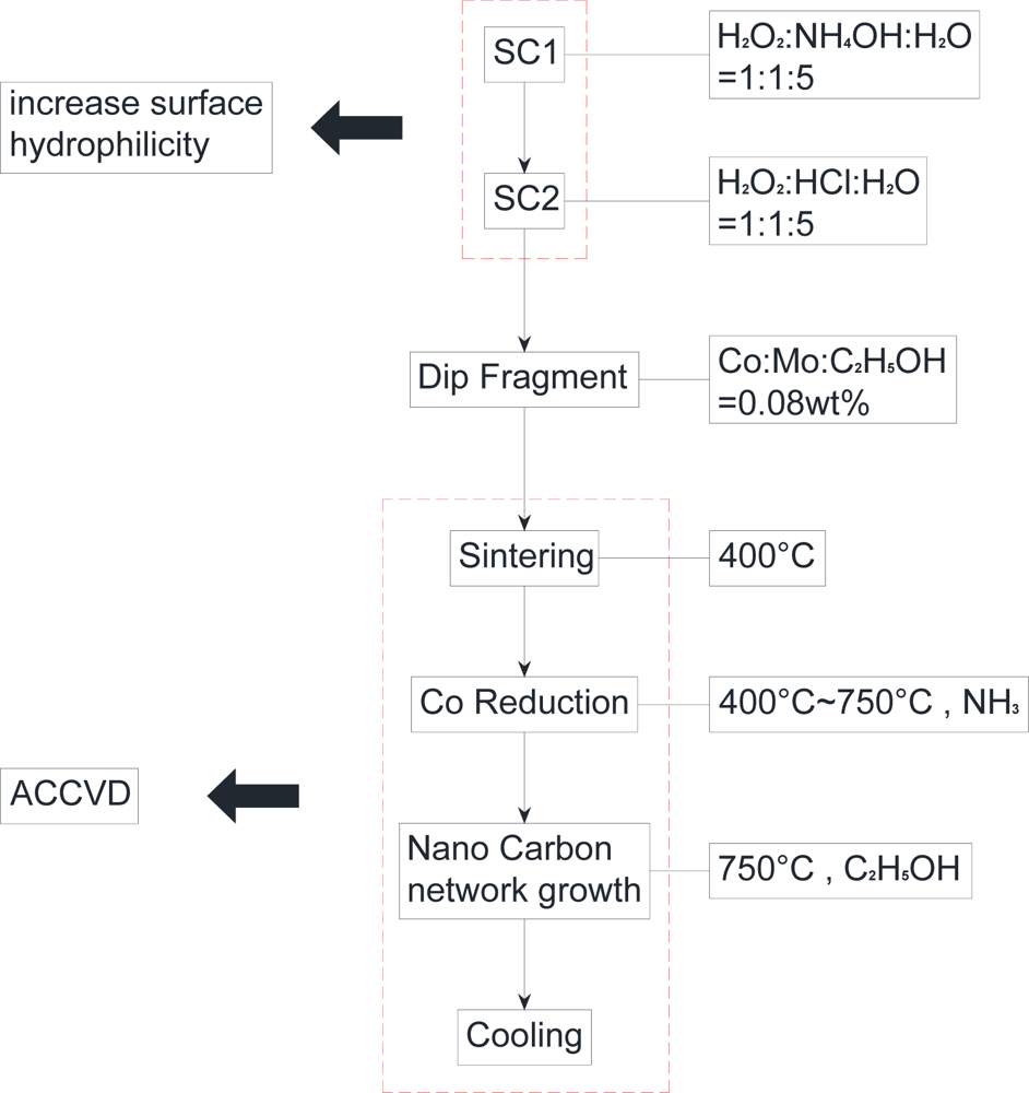 The process used dip set (Dip) to attach the catalytic metal to the fragments. The amount of attached catalytic metal attached is crucial; therefore, the SC1 and SC2 solutions were boiled to temporarily increase the surface hydrophilicity. The SC1 solution was prepared with H2O2-NH4OH-H2O in the ratio of 1:1:5, heated to 75 °C for 20 min. Subsequently, H2O2-HCl-H2O in the ratio of 1:1:6 was used to prepare the SC2 solution, which was heated to 75 °C for another 20 min. Then, the device was cleaned with deionized water and dipped in catalytic metal-Co/Mo solution, the ratio of which was 0.08 wt.% (Co: Mo-C2H5OH), for 10 min. Subsequently, the ACCVD was heated to 400 °C, and the stage quartz fragments were placed and sintered into ACCVD for 7 min and 30 s to allow the catalytic metal to be fixed on the Si substrate. The temperature in the ACCVD process was set to 750 °C, which resulted in gas formation, to restore the oxidation of the catalytic metal. The ACCVD was maintained at 750 °C environment during the growth stage of single-walled carbon nanonets for carbon—alcohol vapor in the chamber. Finally, only Ar gas was passed into the chamber for cooling to complete the growth of the single-walled carbon nanonets.