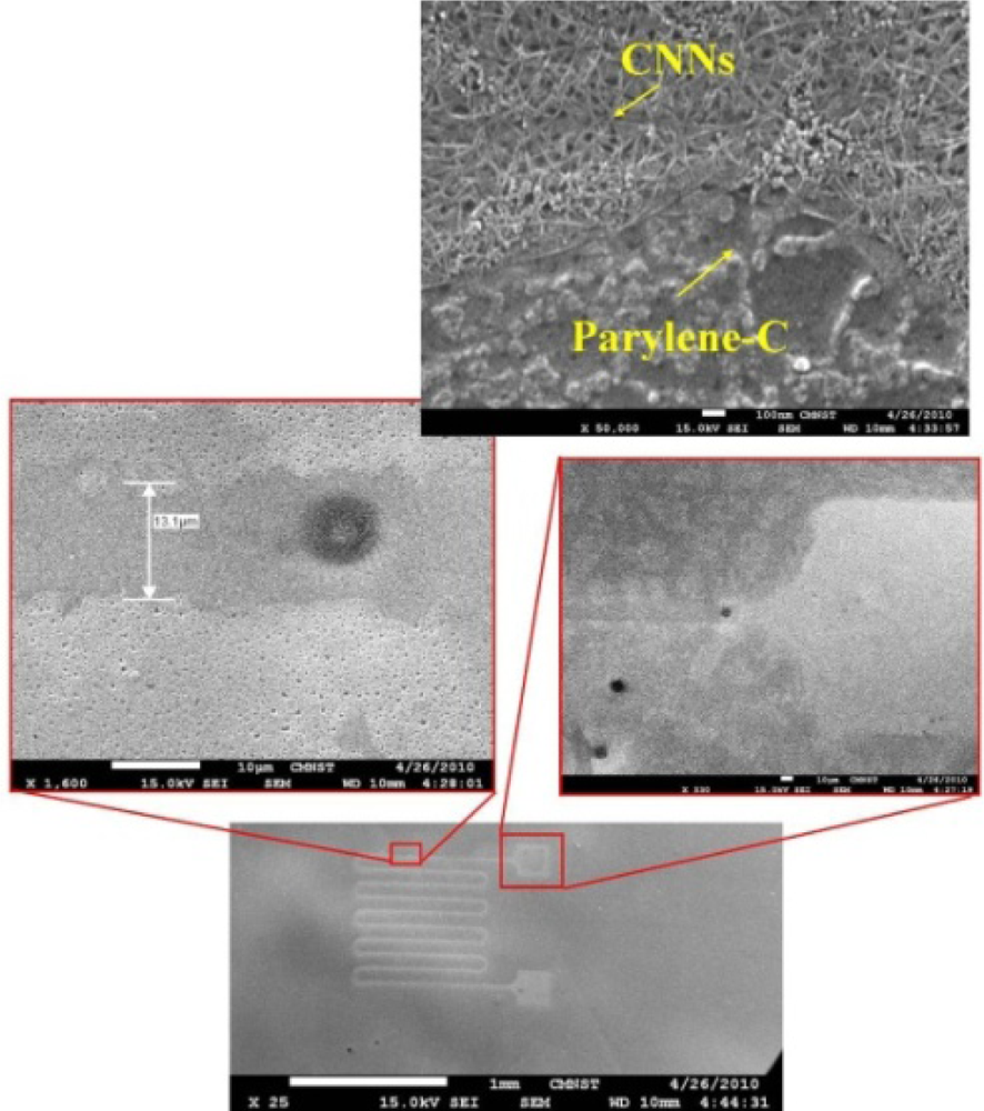 The inset in Figure 5 shows a closer view of the CNNs and Parylene-C, another closer view shows the transfer result with the 10 μm pattern after the Parylene-C is pulled off the silicon substrate.