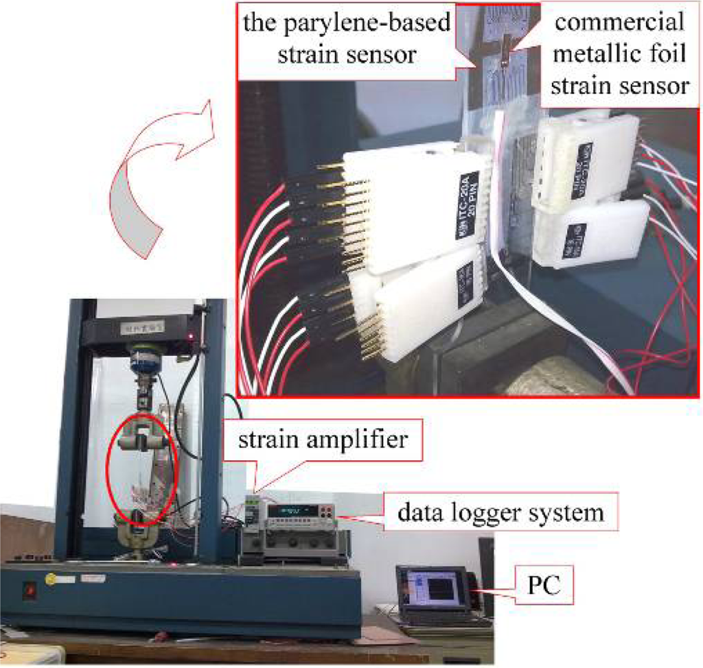 The plate was then attached to a commercial metallic foil strain sensor (KYOWA Electronic Instruments Co., LTD). A strain amplifier (KYOWA, model DPM-711B) was used to obtain the output strain signal as voltage (1 V = 5,000 micro-strain) from the commercial metallic foil strain sensor (The voltage input for the metal foil gauge is 3.7 V). The output signal of resistance from the Parylene-based SWCNNs strain sensor was acquired by a data logger system (Keithley, model 2700), the strain of the plate was measured by a 1/4 bridge Wheatstone bridge with a commercial metallic gauge. The tensile testing experiment is shown in Figure 7.