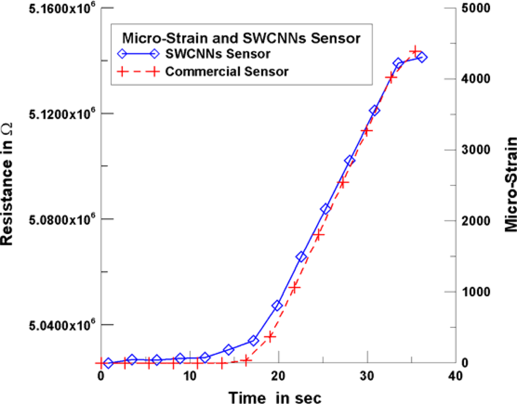 In tensile testing, a commercial strain sensor was used to measure the strain of the test piece. Figure 8 shows the resistance variation and strain variation of a commercial strain sensor and the SWCNNs strain sensor (with growing time of 20 min, line width of 10 μm). Figure 8 shows that, within 0 to 15 s, no variation of resistance of commercial strain sensor occurred; however, a slight variation resistance of SWCNNs strain sensor was observed.