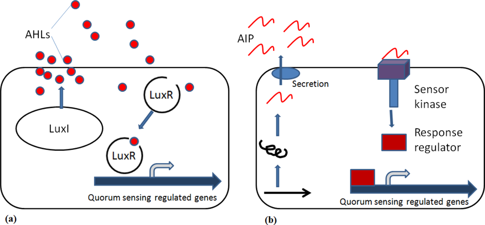 Gram-negative and Gram-positive bacteria communicate by a process termed quorum sensing (QS), which typically involves the production and sensing of QS molecules called autoinducers to link the surrounding cell density with activation of appropriate compensatory regulation of cell function (Figure 1). In Gram-negative bacteria, N-acylhomoserine lactones (AHLs) are arguably the most studied QS signalling molecules. AHLs are usually produced by a protein homologous to LuxI and they will in turn bind to LuxR protein [8]. Once the threshold level of an AHL is detected, transduction leads to the induction of genes that control a variety of survival functions, including the production of antimicrobial substances and protection against the host’s defence mechanisms [9,10].