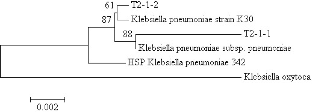 The growth medium became turbid within 48 hours after inoculation with the tongue surface debris suggesting bacterial growth. At the end of the enrichment process, cell suspensions were serially diluted and streaked on LB agar. Pure colonies with distinctive morphologies were obtained after several successive streaks. Isolates T2-1-1 and T2-1-2 from the tongue surface debris specimen were selected for further analysis. The partial 16S rDNA sequences of T2-1-1 and T2-1-2, each comprising 1,532 nucleotides, were deposited in the GenBank under accession numbers HQ907955 (T2-1-1) and HQ907956 (T2-1-2). Web-based search and phylogenetic analysis showed that both T2-1-1 and T2-1-2 were K. pneumoniae (Figure 2).