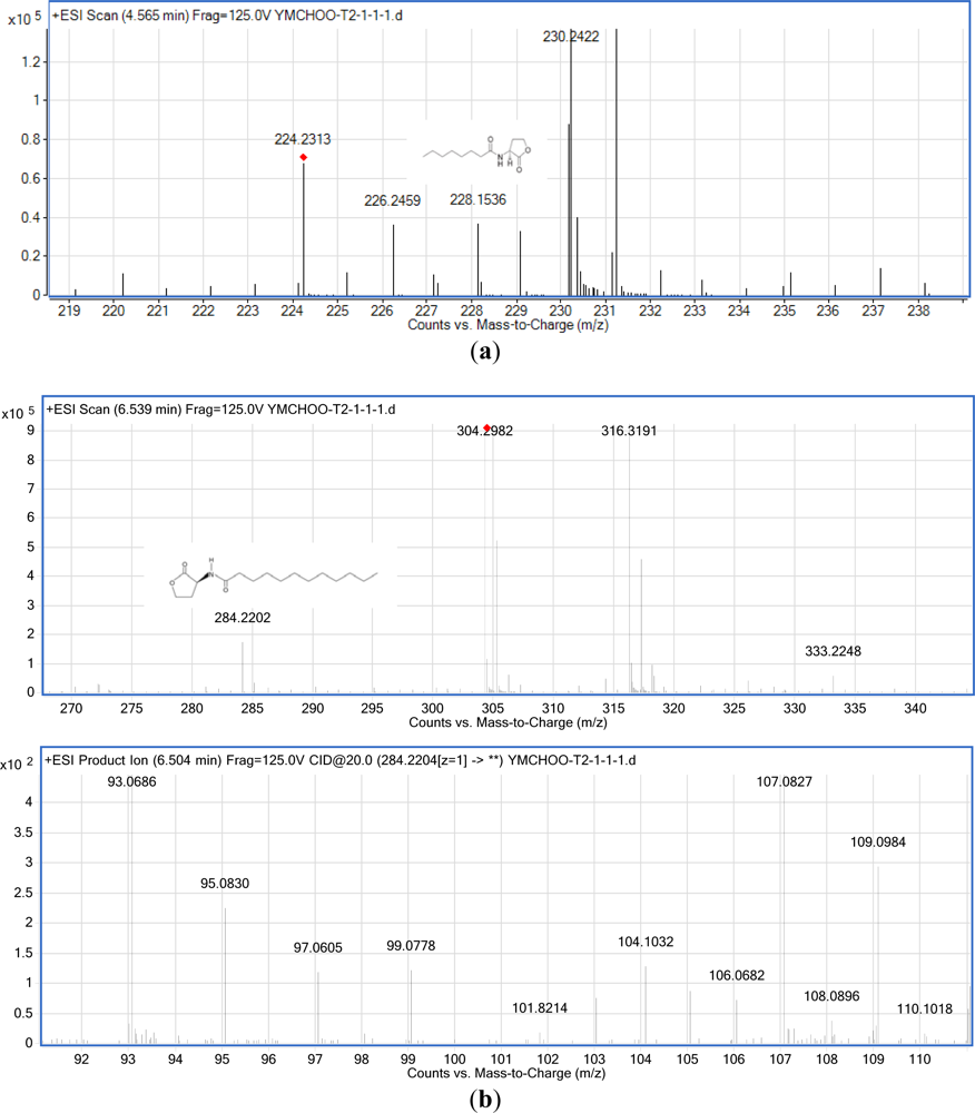 The results of MS (Figure 5) confirmed the presence of C8-HSL (m/z 228.1536) and C12-HSL (m/z 284.2202) in the spent culture supernatant from K. pneumoniae (T2-1-1). The ESI-MS/MS spectrum of C12-HSL shows fragments (m/z 95.0830, 109.0984) typical of lactone-moiety [24]. A similar approach confirmed that K. pneumoniae (T2-1-2) also produced C8-HSL and C12-HSL (the mass spectra for T2-1-2 are not shown). Table 2 summarizes the MS analyses of these AHLs.