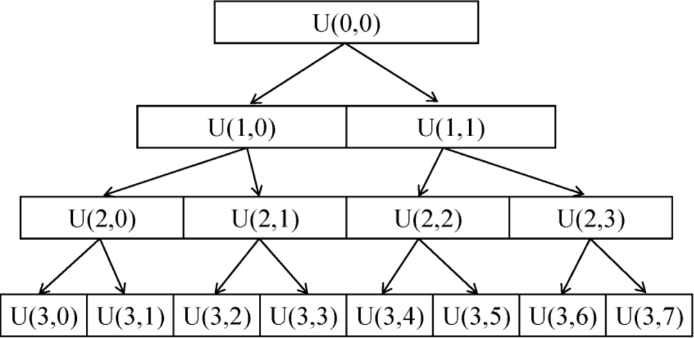 WPT is a derivative of WT. In the fast wavelet transform (WT) [19], a partial multi-resolution analysis is performed. Only approximation coefficients (low-pass node) are employed to deduce both scale and wavelet coefficients at the next resolution level. However, WPT allows a full multi-resolution analysis; both the approximation and detailed coefficients (high-pass node) are involved to decompose at the next resolution level at the same time [20]. As a result, a library of sub-bands including low frequency and high frequency is obtained. A schematic diagram for the WPT decomposition was shown in Figure 1. In the diagram, each node is identified by the pair of indices U (j,k), where j is the level of decomposition and k is the position of the node at that level of decomposition.