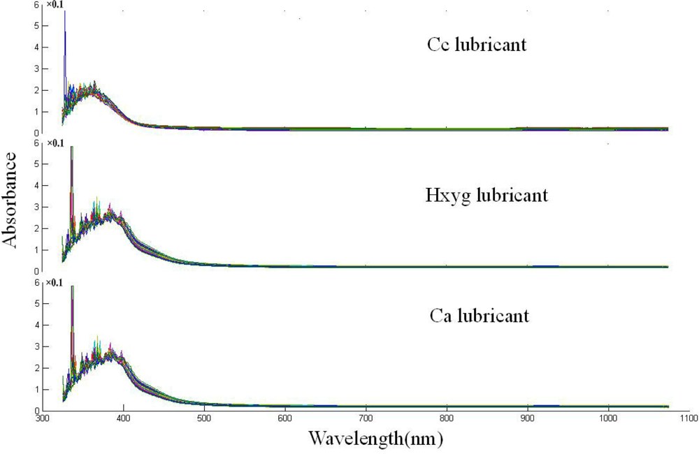 Typical spectra of three varieties of lubricants are shown in Figure 2. Due to potential system imperfection, the scattering ray affects the accuracy of measurement; there is lots of noise in the 325–400 nm region. The spectra of samples from all three varieties have similar gross patterns of absorbance, there is a sharp absorption peak round 380 nm. After 400 nm, the absorbance values begin to decrease, and the spectral curve is flat. Though the trend of the spectra is similar, some latent differences and features exist according to the chemical components and color variance which could not be distinguished by the naked eye. With a closed observation, a small difference between Cc lubricant and the two other lubricants existed in the 400–450 nm region, which might have resulted from the color variance.