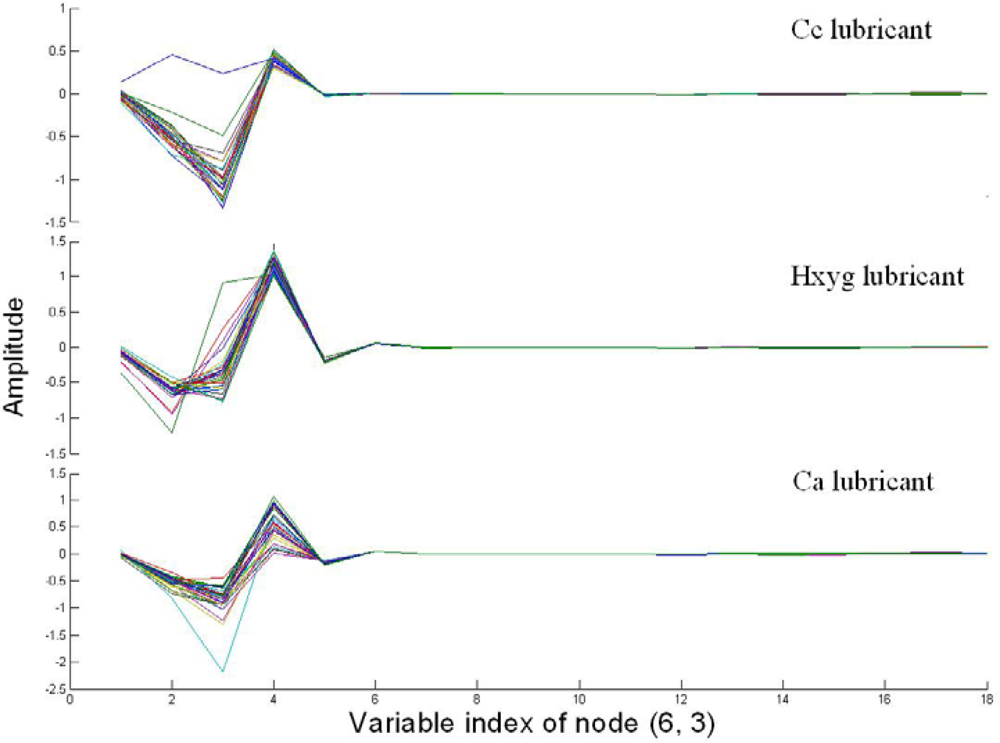 Figure 4 shows the coefficients of node (6,3) of three varieties of lubricants. Compared with Figure 2, there was obviously variance among three varieties of lubricants, which could be discriminated by the naked eye. Moreover, it also could be found from Figure 4, that the trend of the curve of the same variety was very similar, except there was only an abnormal curve in the Cc lubricant.