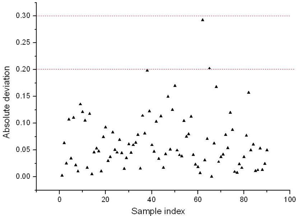 The retained five variables constituted a new set of variables for LS-SVM (BVB-RV-LS-SVM). The performance of BVB-RV-LS-SVM was evaluated by the same 90 unknown samples mentioned above, and R of 0.9950 and RMSEP of 0.0829 were obtained, respectively. The absolute deviation of prediction results of each sample is shown in Figure 8. As one could see from Figure 8, when the threshold error was set as ±0.3, no sample was mistakenly discriminated, if the threshold error was ±0.2, there were only two misclassified samples, these were samples 62 and 65, and the total discrimination rate reached 97.78%. Therefore, compared with BVB-LS-SVM, the BVB-RV-LS-SVM model not only improved the prediction accuracy greatly, but also produced a more parsimonious model.