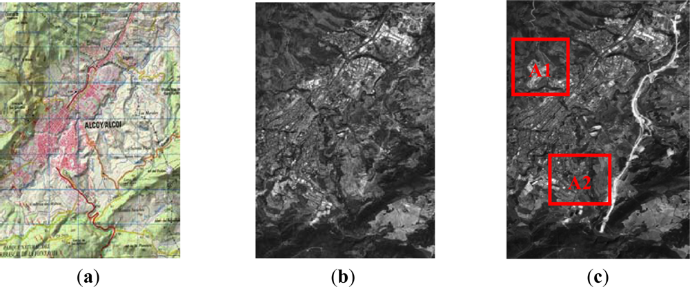 The working area used for this study is located on the Eastern part of the Iberian Peninsula, centered on geographic coordinates {φ = 38°42′05″N, λ = 0°28′37″W}, and with an extension of 4.5 × 6.6 km2 (Figure 1). This area is constituted of an urban nucleus surrounded by a large rural area. For this analysis, and depending on the data type and its spatial resolution, either the whole area will be taken into account, or it will be limited to certain sub-areas Figure 1(c). This choice is mainly due to the fact that during the years 2005 and 2008, this area has suffered important landcover changes caused by aggressive urban and infrastructure development policies, so it is of special interest for change detection analysis.