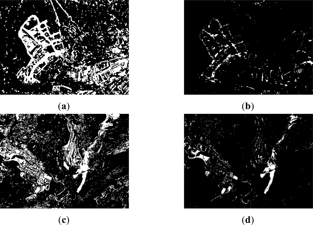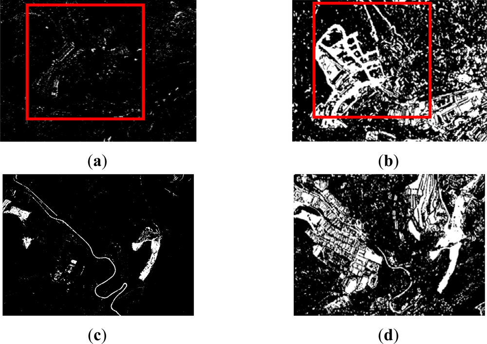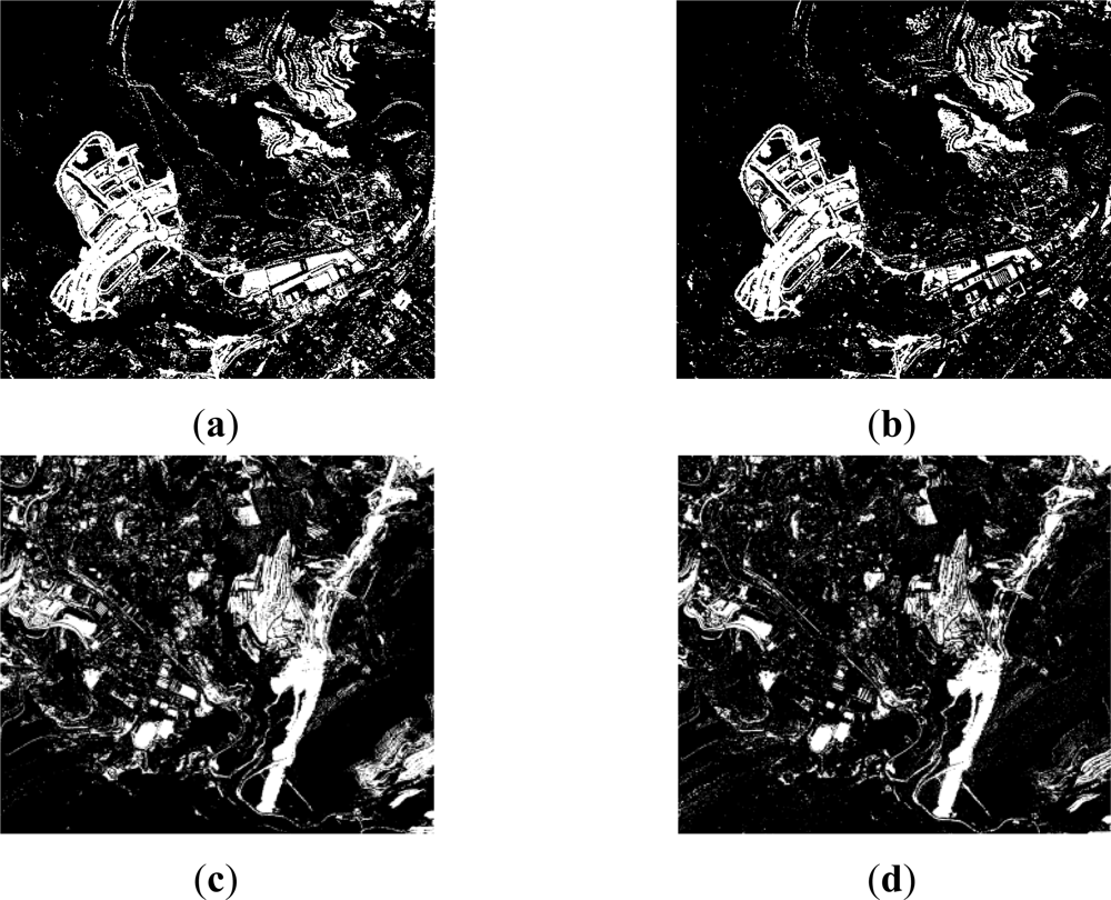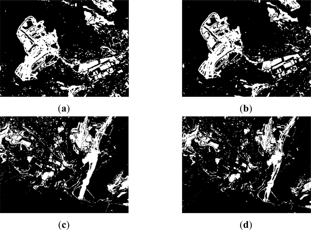 Subsequently, the deficiencies identified in the corresponding change detection indices are also transmitted to the thresholding results. As it may be expected, the CVA method delivers poor results (Figure 8(a)). However, for the second analyzed area (Figure 8(c)), it can be appreciated, that the Yen method exhibit correctly certain changes contained in the input data file (CVA index), thus yielding an improvement in the accuracy. This result might be due to the capability for solving the compactness between categories of the Yen method [41].