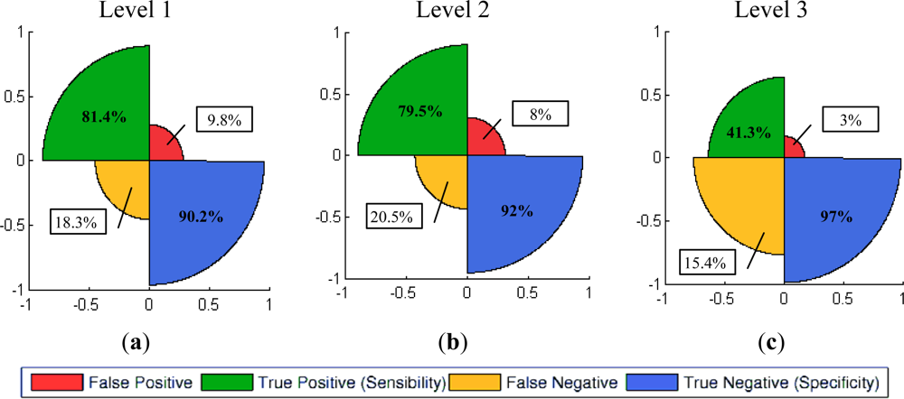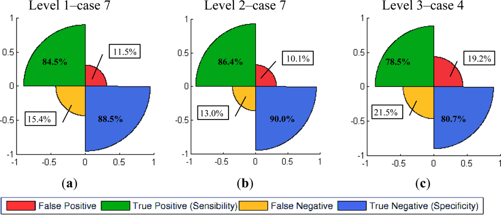 The last part of this section describes the graphical representation of the quality measures for the three levels of resolution. For the summative method, only the best results (cases 7–l1, 7–l2 and 3–l4) achieved for each level are shown in Figure 12. For this purpose rose plots [51] have been used. These diagrams are constructed from the information contained in confusions matrices, their different sectors indicate the percentages of true and false positives, as well as the corresponding negatives. The high proportions of true positives and negatives vs. the lower proportions of false negatives reveal the good performance of this informational fusion method for levels 1 and 2 for the given cases. This tendency changes for level 3, where the sectors corresponding to the false positives and negatives increase noticeably.