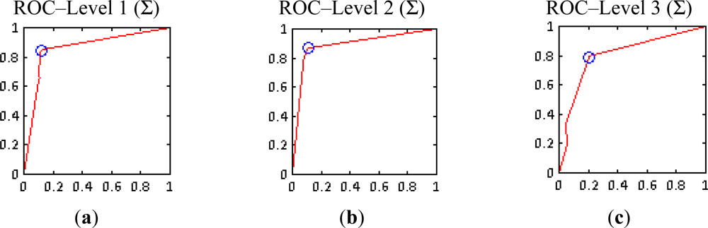 Regarding level 3, although a similar trend is also observed, this representation depicts the deficient results reached for this level (Figure 14(c)). Finally, for representing the results of the multiplicative method by means of ROC curves, a unique solution was accessible for each level, so these curves are built up based on these single results (Figure 15).