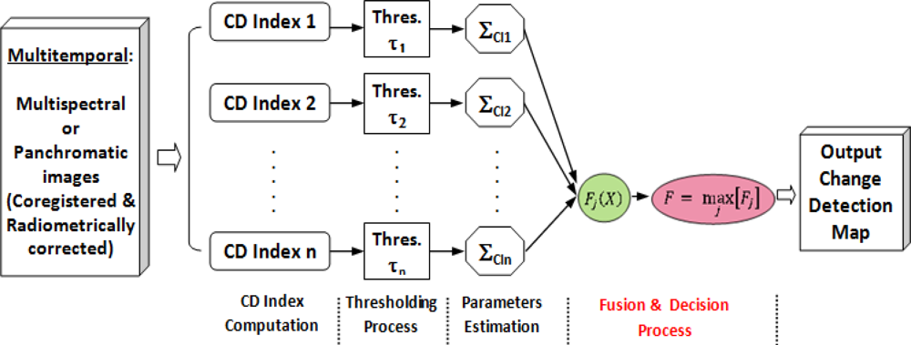 Thus, in this study, a multisource CD methodology based on different change indices, which might be implemented in a non-supervised fashion, is accomplished. This makes the main contribution of this paper. Likewise, an essential part of this study consists in assessing the influence of a particular index during the decision process. For this purpose, thresholding operations are also applied, so that the statistical parameters of the change/no_change categories for each index can be estimated conveniently. Then, the distinct change detection indices and related parameters are integrated into an informational fusion process, and a unique change detection document is derived. Finally, it is also shown that the addressed methodology is applicable and extensible to datasets with different levels of spatial resolution.