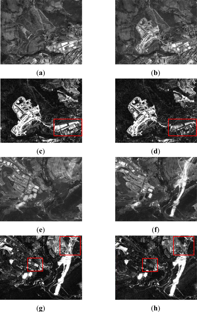 In area A2 (Figure 4(g,h)) some differences between the two indices are still recognized, but they are not as apparent as in the previous case. These preliminary results enforce the idea that different indices derived from the same image may also contain complementary information. This means that a particular change detection index can highlight some information which is not shown by another index, and vice versa, as shown in Figure 4(c,d,g,h). Thereby, change detection indices complement themselves.