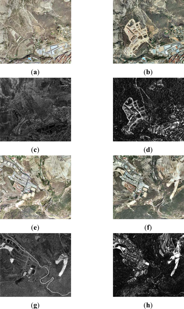 For level 3, the corresponding processes have been applied to the same areas. Although, these data are also multispectral images, the near infrared band is not available, so it has been impossible to derive the CD NDVI difference index. Subsequently, the CVA method appears to be most suitable for this purpose. Moreover, as it has been anticipated in Section 2.2.1, an additional CVA index has been computed using textural features based on the homogeneity operator. Figure 5 shows the results of the CVA method applied to the original dataset of level 3, as well as to their corresponding textural features. At this stage, the differences between the derived CD indices are properly distinguished. Although, in both cases the same method is applied, the most notable differences are observed when the textural measures are introduced Figure 5(d,h). Finally, and for convenience, all indices based on the difference index, have all been transformed into positive values by applying the absolute value function.