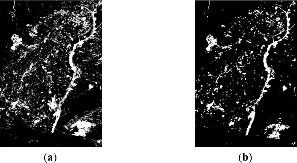 Thus, the CVA CD index computed with these new features is thresholded adequately by means of iterative (Ridler), clustering (Otsu) and entropic (Li) algorithms. However the latter exhibits a better overall performance, 79% vs. 76% (by averaging the overall accuracy of both areas). Producer’s and user’s accuracies exhibit also similar values, so they are not reported here. Moreover, revising the statistics of this CD index, its dynamic range varies from NVmin = 0 to NVmax = 140, which is a rather large interval denoting an important informational content. Thus, this last result confirms again the usage of the Li method. The thresholding results corresponding to this index (CVAtext) are depicted graphically in Figure 8(a–d), where the differences with the thresholded CVA CD index derived from the original dataset, are clearly highlighted. An obvious increase of information can be appreciated when textural measures are taken into account.