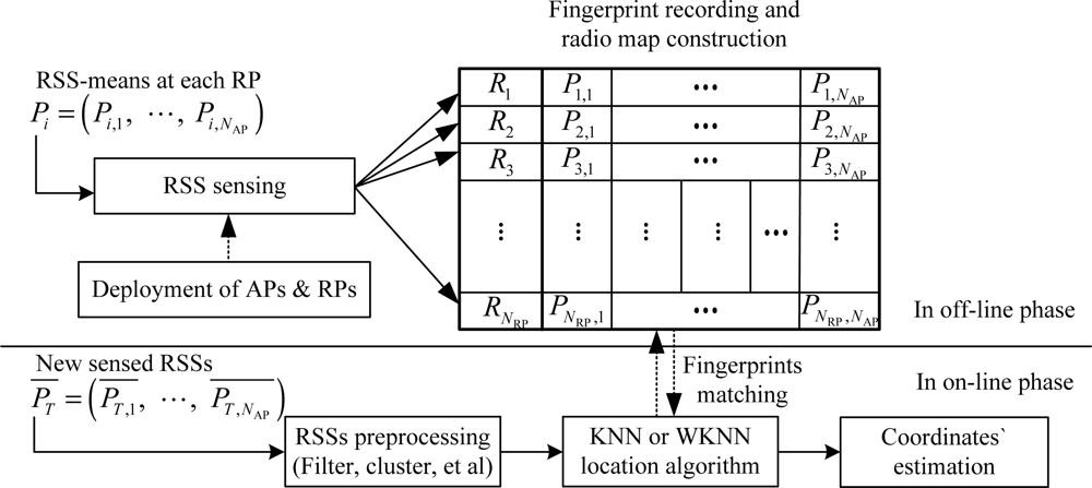 The Wi-Fi fingerprint-based localization in RLSNs generally consists of the following three steps [28–30]: (1) in the off-line (or calibration) phase, the Wi-Fi APs are deployed to provide sufficient and seamless RSS coverage in the target location areas, which means, at any physical position, the user can detect and sense the continuous-time RSS from two or more visible APs; (2) the coordinates of pre-calibrated RPs (or the physical locations for fingerprint matching) and their associated RSS samples will be saved as the fingerprints in the radio map. At this point, the fingerprints can be suggested as the mapping relationships between the physical coordinates and pre-sensed RSS values. For example, the fingerprints in RLSNs can be defined as the mapping relations between the 2-D coordinates and user datagram protocol (UDP) RSS samples; (3) in the on-line (or estimation) phase, by matching the new sensed RSS to the pre-stored fingerprints (fingerprint matching), the users’ positions will be estimated by the equal or unequal-weighted sum of the (K) neighbors’ coordinates.