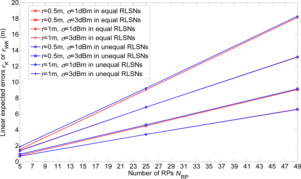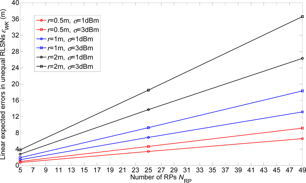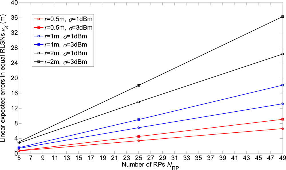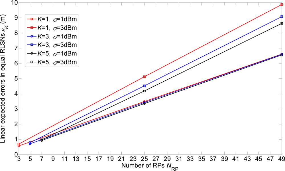 Overall, as a general and simple model of the in-building straight corridors, the analytical analysis on the statistical errors in linearly distributed RPs environment seems to be much more necessary and important than the other environments, such as the offices, washrooms and meeting rooms. Further, the differences with the previous work about statistical error discussions can generally be summarized as follows: (1) A better RADAR system in RLSNs with higher expected localization accuracy can be designed only with the help of the analytical relations addressed in the paper, but not involving any cumbersome work for the experimental evaluations. Therefore, the labor and time costs can be saved; (2) There are K (K > 2) neighboring RPs to be considered together in the on-line estimation phase, not just one pair of two RPs. Meanwhile, the linear model introduced in this paper can also be verified to perform much more effectively because the increase of K will also improve the localization accuracy; (3) Last but not least, the deployment of RPs with distance interval r is more practical and reasonable compared to the random models and it will also achieve lower cost for the fingerprint recording.