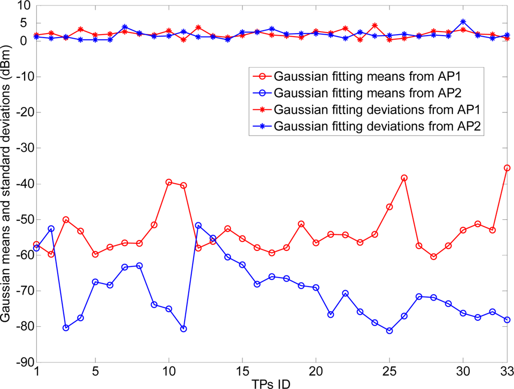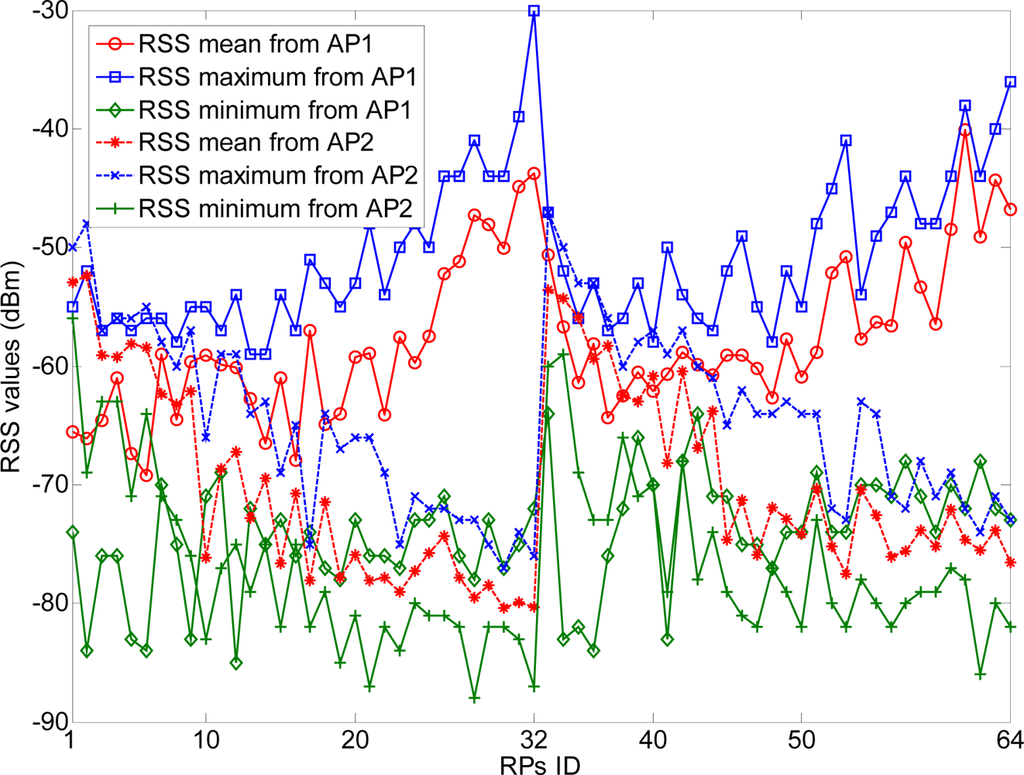 There are two line-of-sight (LOS) visible APs (Linksys WAP54G) located at the right and left ends of the corridor at 2 m height, respectively. At each RP (indicated with •’s), there are 300 continuous-time RSS samples recorded for the construction of radio map. The variations of RSS-mean, maximum and minimum are shown in Figure 12. Obviously, if we record the RSS-mean and associated coordinates as the fingerprints, the pre-assumed logarithmic Gaussian channel can be effectively satisfied.