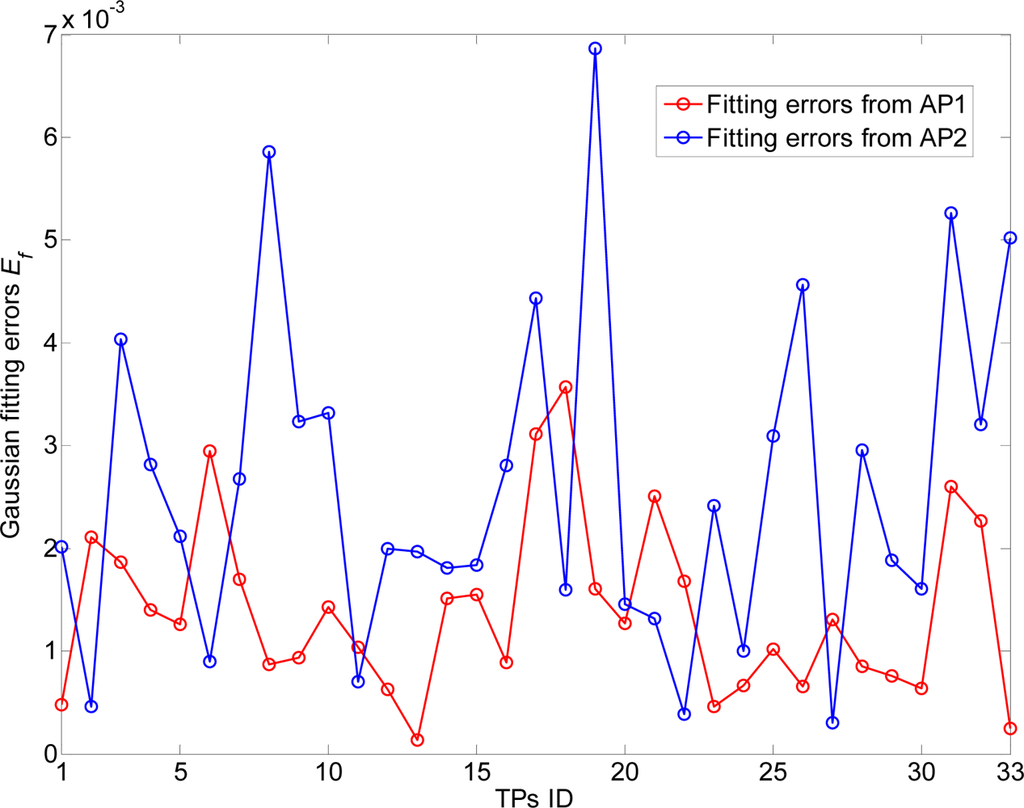 For consistency to our previous mathematical model, the positions of TP (with +’s) are randomly selected in this straight corridor environment. As shown in Figures 13 and 14, the RSS distributions at the TPs (100 new recorded RSS samples per TP) are fitted well by the Gaussian models with small fitting errors , where, and denote the real recorded and fitted probabilities of sample . Ef is calculated by the expectation of the probability difference of and . Moreover, the RSS samples are recorded by a laptop (ASUS A8F) with our developed RSS sensing software “HITWLAN v1.0” [32] in Figure 15.