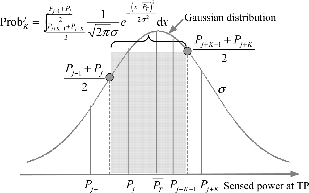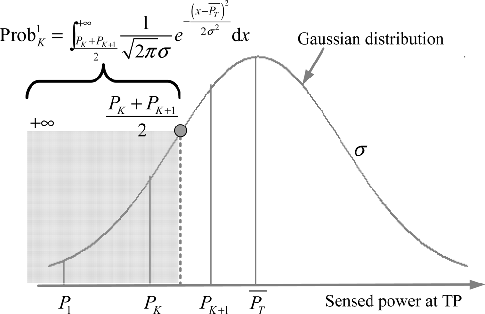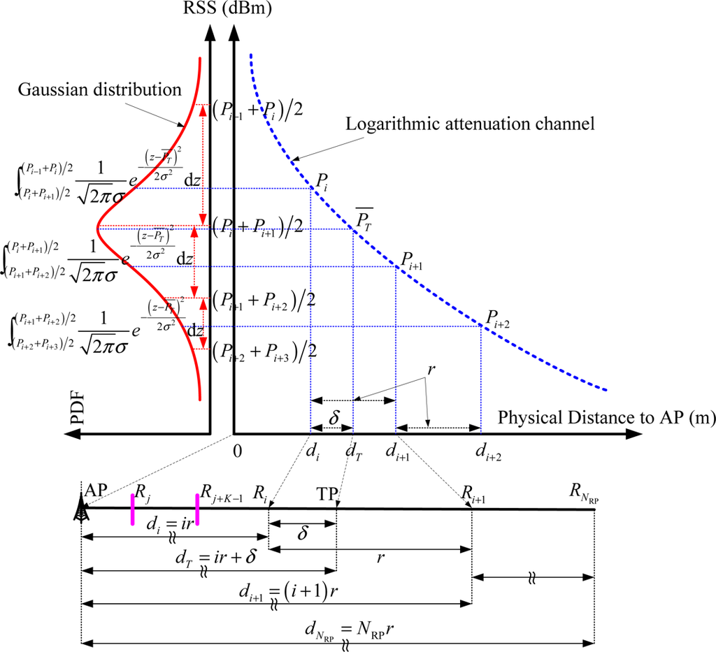 As shown in Figure 2, there are NRP RPs uniformly calibrated in the linear location area with distance di = ir to the AP. The pre-sensed RSS-mean at each RP and the new sensed RSS-mean at TP are respectively calculated by the logarithmic channel Pi = Pt − L0 − 10αlgdi and PT = Pt − L0 − 10αlgdT. The geometrical relations and associated RSS distributions to be discussed are also presented in Figure 2. By the assumption of Gaussian RSS variations at TP, the confidence probability of Ri to be selected as the most RSS-adjacent neighbor is calculated by the integral .