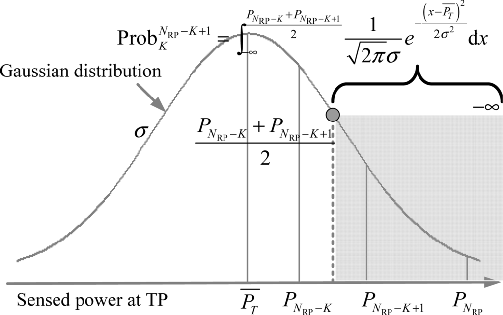In the first step, we need to discuss the following three cases in different neighbor sets conditions, respectively. Based on the Gaussian variations of the new sensed RSS at TP, the probability of each case will significantly depend on the values of j (j = 1, j = 2, ⋯ ,NRP − K and NRP − K + 1).