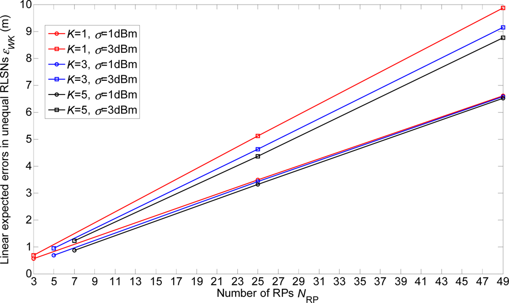 In Figures 6 and 7, we show the linear expected errors of the equal and unequal-weighted RLSNs, respectively, given that the TP is actually located with the physical distance dT = ir + δ to the AP. These are derived from Equations (6) and (13) and plotted as the functions of the number of RPs NRP. Clearly, as NRP increases, the linear expected errors will also increase. However, the errors will not vary a lot with the increase of K. Take equal RLSNs for example. At NRP = 25 and σ = 3 dBm, the decreasing rates of errors from K = 1 to K = 3, and from K = 3 to K = 5 are 11.7% and 7.5%.