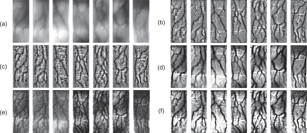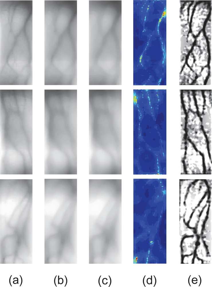 Here, some captured finger-vein image samples are collected to demonstrate the validity of the proposed method in finger-vein image restoration. Figure 9 shows some examples of the estimated V (x, y), Ir(x, y), T (x, y) and restored finger-vein images I0(x, y). After scattering removal, the contrast of finger-vein images is improved significantly, and the vein networks present in the restored images can be clearly distinguished from the background. This shows that the proposed optical model allowing for the effects of light scattering in skin layer, particularly the multiple scattering, is desirable for describing the mechanism of finger-vein image degradation.