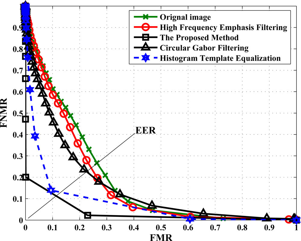 For finger-vein matching on this database, the number of genuine attempts is 3,150 , and the number of impostor attempts is 241,500 . By respectively using the original images, HTE-based images, HFEF-based images, CGF-based images, ImD-based images and the proposed restored images for finger-vein matching under POC (Phase-Only-Correlation) measure, the ROC (receiver operating characteristic) curves are plotted in Figure 11, where false non-match rates (FNMR) and false match rates (FMR) are shown in the same plot at different thresholds on the POC matching score, and EER (equal error rate) is the error rate where FNMR and FMR are equal.