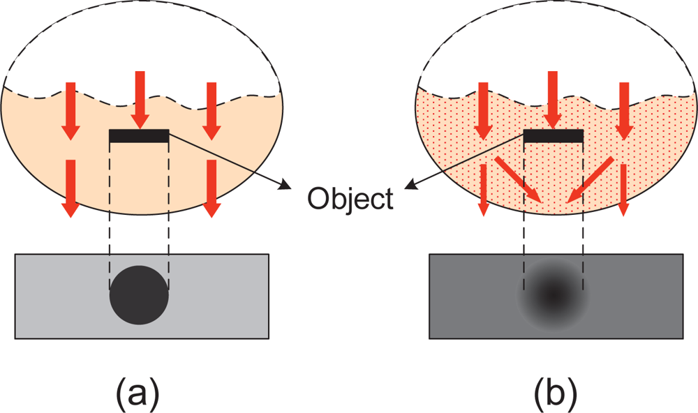 Generally, in order to visualize finger-vein vessels inside the finger tissues, the near infrared (NIR) transillumination is often adopted in imaging devices, as shown in Figure 1(a,b). As the hemoglobin in blood vessels absorbs more NIR radiation than other substances in finger tissues [1], the intensity distribution of transmitted NIR rays vary spatially. Vein vessels cast darker “shadows” on imaging plane while other tissues present a brighter background, as shown in Figure 1(c). Since the biological tissues can be viewed as a kind of highly heterogeneous optical medium, multiple light scattering predominates in lights that penetrate through a biological tissue layer [2]. Thus, the quality of finger-vein images is always poor because the scattering effects can greatly reduce the contrast between the venous and non-venous regions [3]. The basic concept of image degradation due to light scattering is illustrated in Figure 2. If no light scattering is generated in optical medium, a real shadow of an object must appear on the imaging plane, as shown in Figure 2(a). However, the object shadow always is blurred to a certain extent since light scattering is inevitable in real situations, as shown in Figure 2(b).