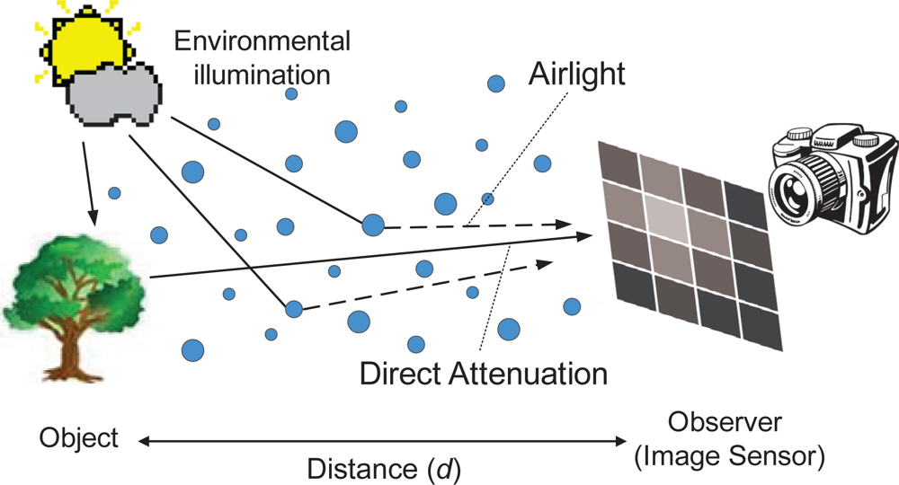 As illustrated in Figure 3, the first effect of atmospheric scattering is called direct attenuation, and can be described by Beer–Lambert law, which results in an exponential attenuation of object intensity with the transmission distance through scattering media, i.e., the first term e−KdI0 on the right side of Equation (1). The second effect, referred to as airlight in Koschmieder theory of horizontal visibility, is caused by the suspended particles in haze or fog that scatter the environmental illumination toward the observer. The airlight acts as an additional radiation superimposed on the image of the object, whose intensity is related to the environmental illumination I∞ and increases with pathlength d from the observer to the object, as described by the term (1 − e−Kd)I∞.