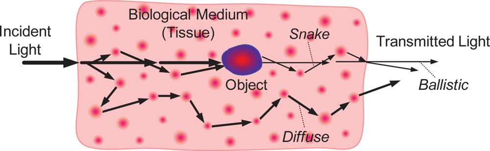 From the biophotonic point of view, as the light propagates through a tissue, the transmitted light is composed of three components—the ballistic, the snake, and the diffuse photons [24], as shown in Figure 4. Ballistic photons travel a straight, undeviated path in the medium. Snake photons experience some slight scattering events, but still propagate in the forward or near-forward direction. Diffuse photons undergo multiple scattering and emerge from random directions. Obviously, in transillumination imaging of objects embedded in the biological tissue, the ballistic photons with propagation direction preservation can form sharp shadows of objects on the imaging plane, whereas the multiple scattered diffuse photons can inevitably reduce the contrast of the shadows as well as giving rise to the unwanted, incoherent imaging background [25]. That is to say, the multiple scattering is the most unfavorable factor that contributes to diffuse photons and further leads to image blurring in optical transillumination imaging.