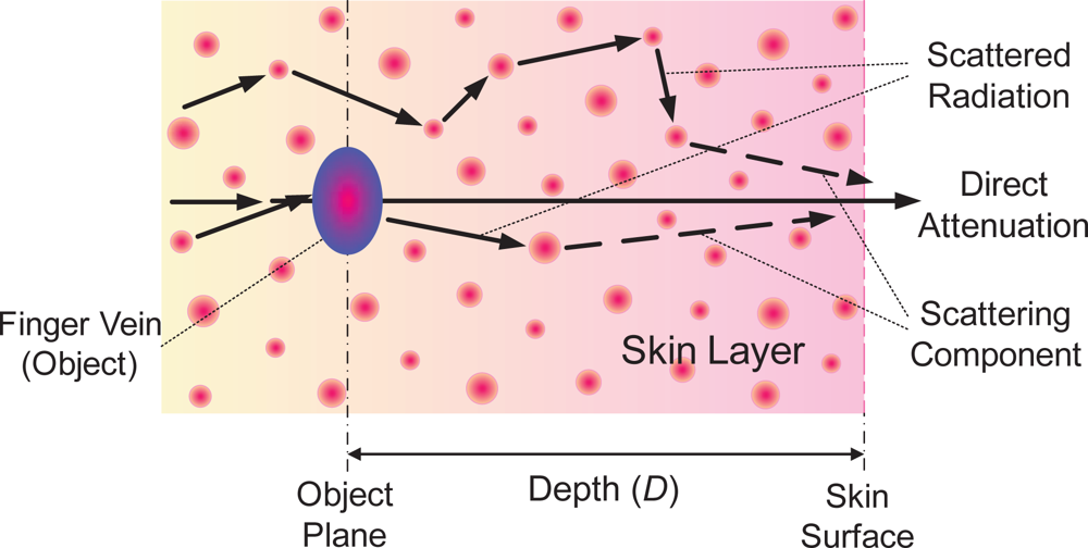 Based on the preceding analysis of image dehazing model, and associated with the knowledge of light propagation through biological tissue, we propose a simplified skin scattering model to characterize the effects of skin scattering on finger-vein imaging, as shown in Figure 5.